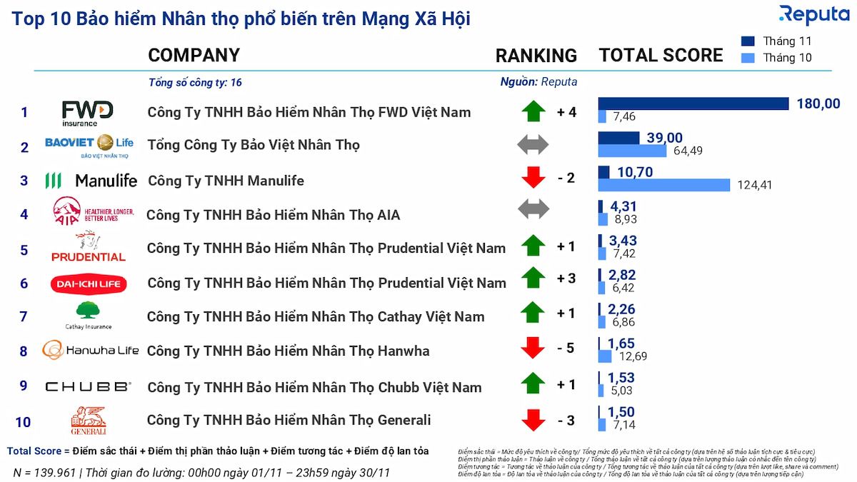 - Manulife giảm 2 hạng xuống vị trí Top 3 với 10,70 điểm Total Score, giảm 91% so với tháng trước.