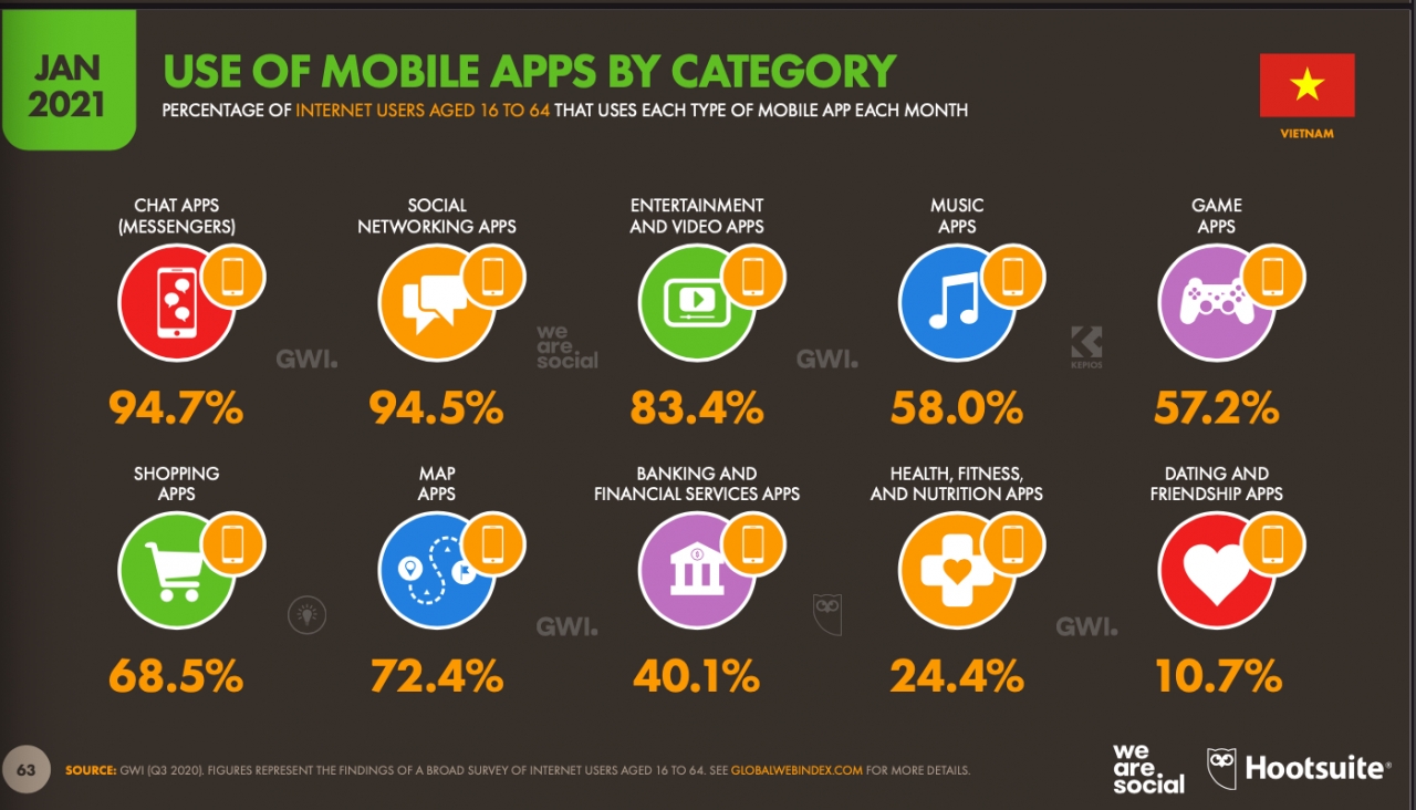 Các nhóm ứng dụng di động được sử dụng nhiều nhất bao gồm: Nhắn tin, trò chuyện (94,7%), giải trí và xem video (83,4%), nghe nhạc (58%), chơi game (57,2%), mua sắm (68,5%), tài chính và ngân hàng (40,1%).