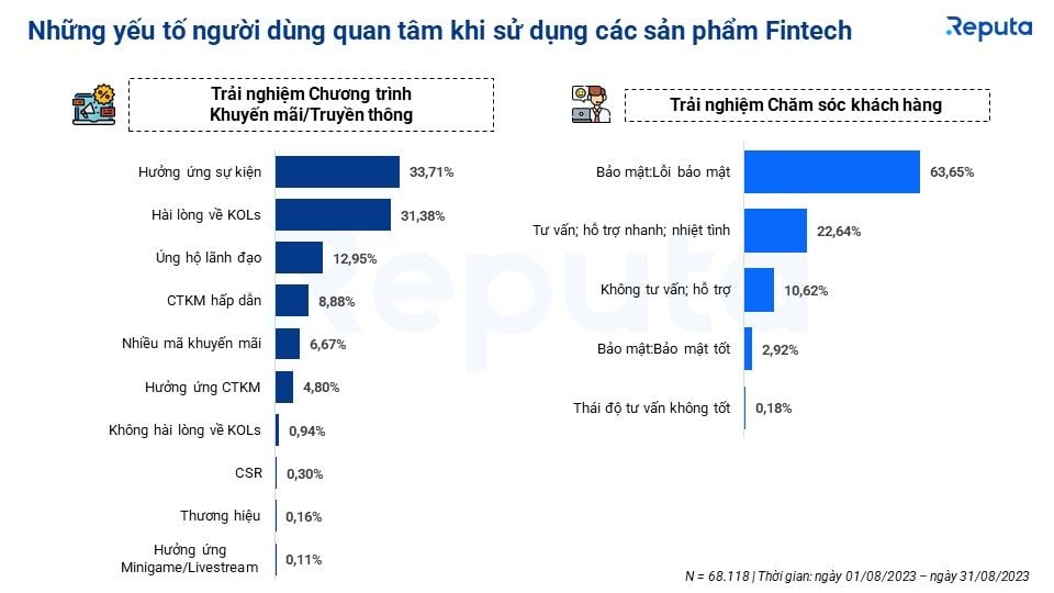 Người dùng chủ yếu quan tâm đến các sự kiện và ưu đãi do các công ty Fintech và Ngân hàng số triển khai (33,71%). Lỗi bảo mật cũng là mối quan tâm lớn, chiếm 63,65% lượng thảo luận.