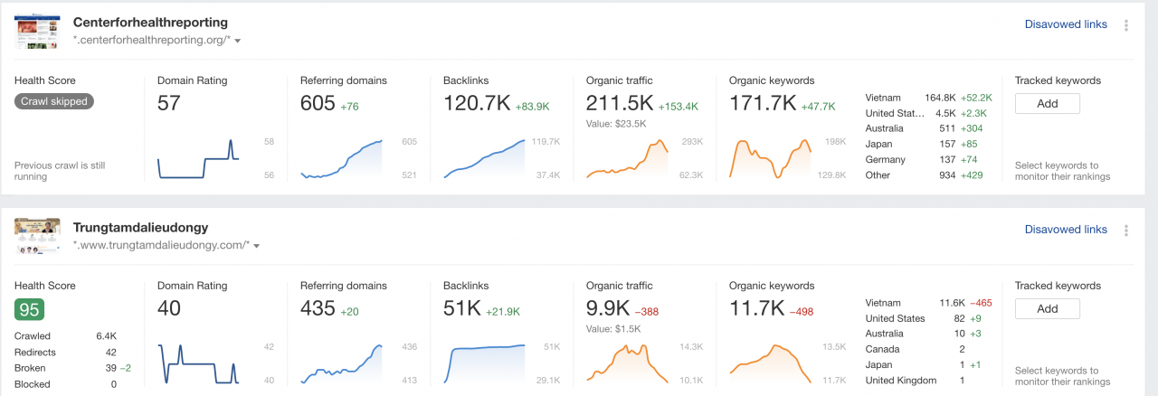 Ở Việt Nam, các trang web lớn trong lĩnh vực y tế như Ihs Việt Nam, Heal Central và Taoviet.vn đã bị tụt hạng trong những ngày gần đây. Tuy nhiên, một số trang web vệ tinh với hồ sơ liên kết khiêm tốn và nội dung không đạt chuẩn lại có sự tăng trưởng đáng kể, chẳng hạn như ChuyenGiaDaDay.com với mức tăng trưởng lưu lượng truy cập lên tới 88%.