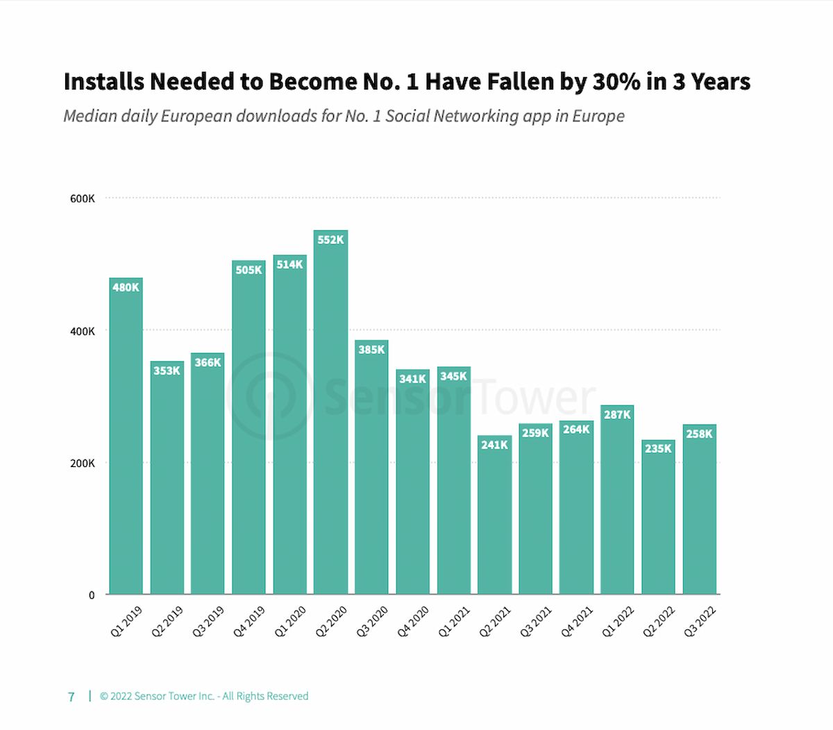 - TikTok vẫn là ứng dụng mạng xã hội phổ biến nhất ở Châu Âu, nhưng số lượt tải xuống cần thiết để đạt được vị trí số 1 đã giảm 30% trong 3 năm qua.