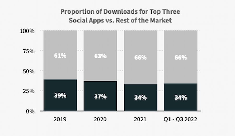 - Sự tập trung của thị trường đang giảm, với 3 ứng dụng hàng đầu chiếm 34% thị phần trong năm 2022, giảm so với mức 39% vào năm 2019.