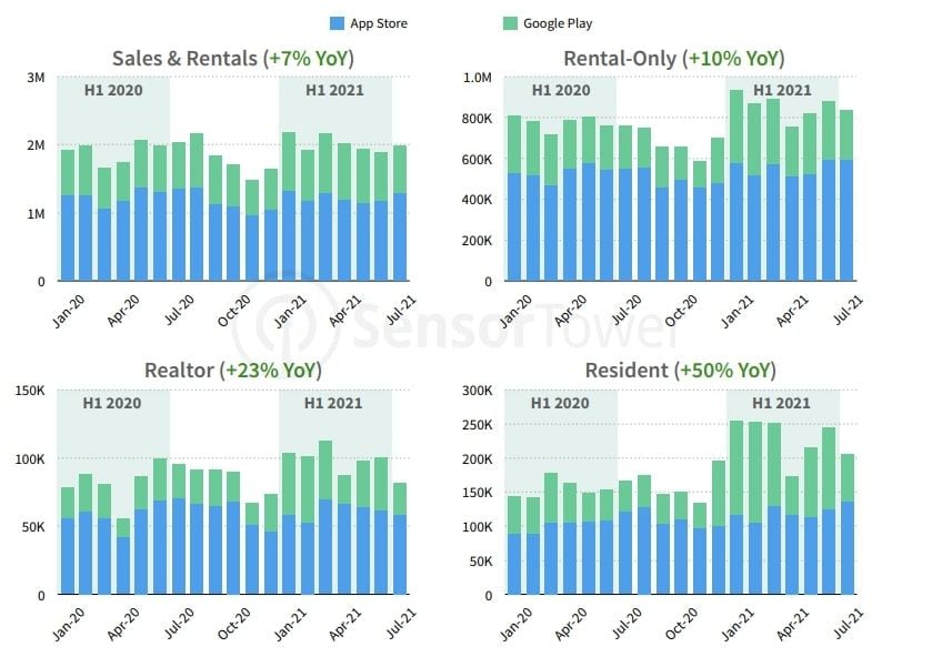 Các ứng dụng bán cho thuê nhà chiếm phần lớn thị trường ứng dụng bất động sản, với 68% lượt cài đặt trong nửa đầu năm 2021. Apartments.com và Zillow Rentals là những ứng dụng hàng đầu trong danh mục này, chiếm lần lượt 28% và 23% lượt cài đặt.