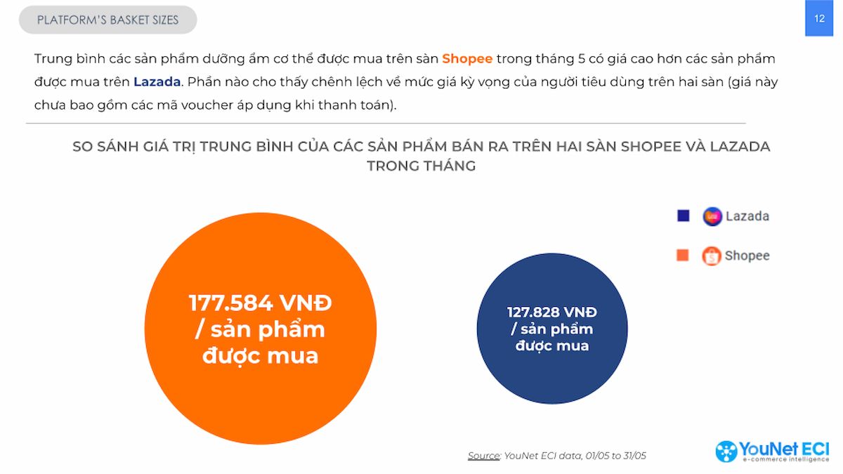 Trung bình các sản phẩm dưỡng thể được người tiêu dùng chọn mua trên Shopee có giá cao hơn các sản phẩm được mua trên Lazada 50.000 đồng. Điều này cho thấy sự chênh lệch về mức giá kỳ vọng của người tiêu dùng khi lựa chọn sản phẩm dưỡng thể trên hai sàn.