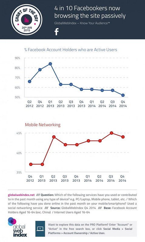 Theo nghiên cứu của GlobalWebIndex, chỉ hơn một nửa (52%) số tài khoản Facebook là hoạt động vào cuối năm 2014, giảm đáng kể so với con số 70% vào năm 2012. Điều này có nghĩa là trên 10 tài khoản Facebook thì có tới 4 tài khoản truy cập một cách thụ động.