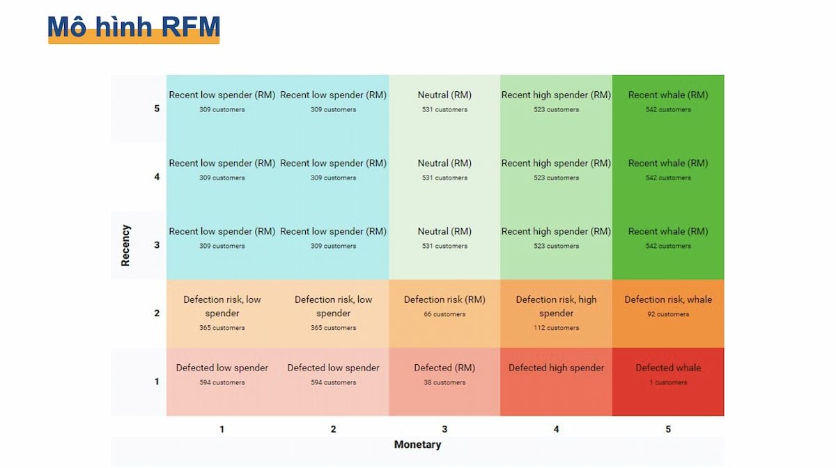 Mỗi yếu tố RFM được chấm điểm từ 1 đến 5, với 5 là điểm cao nhất. Điểm được cộng dồn lại để tạo thành ma trận phân nhóm khách hàng.