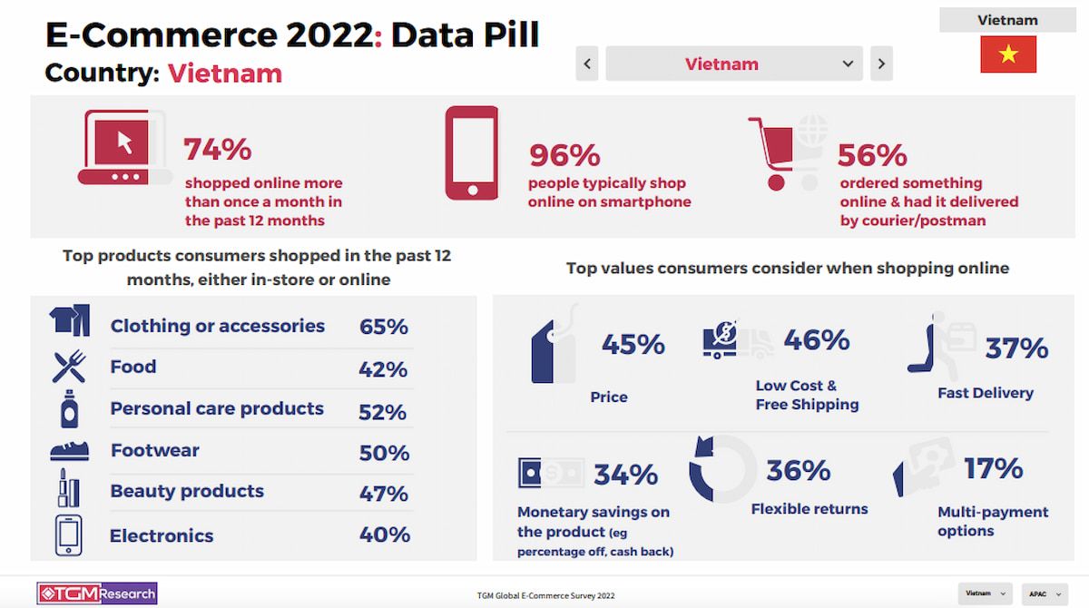 Thị trường thương mại điện tử Việt Nam đang phát triển nhanh chóng với tần suất mua hàng trực tuyến cao và sự phổ biến rộng rãi của các thiết bị di động. Điện thoại thông minh là thiết bị được ưa chuộng nhất để mua sắm trực tuyến, tiếp theo là máy tính.