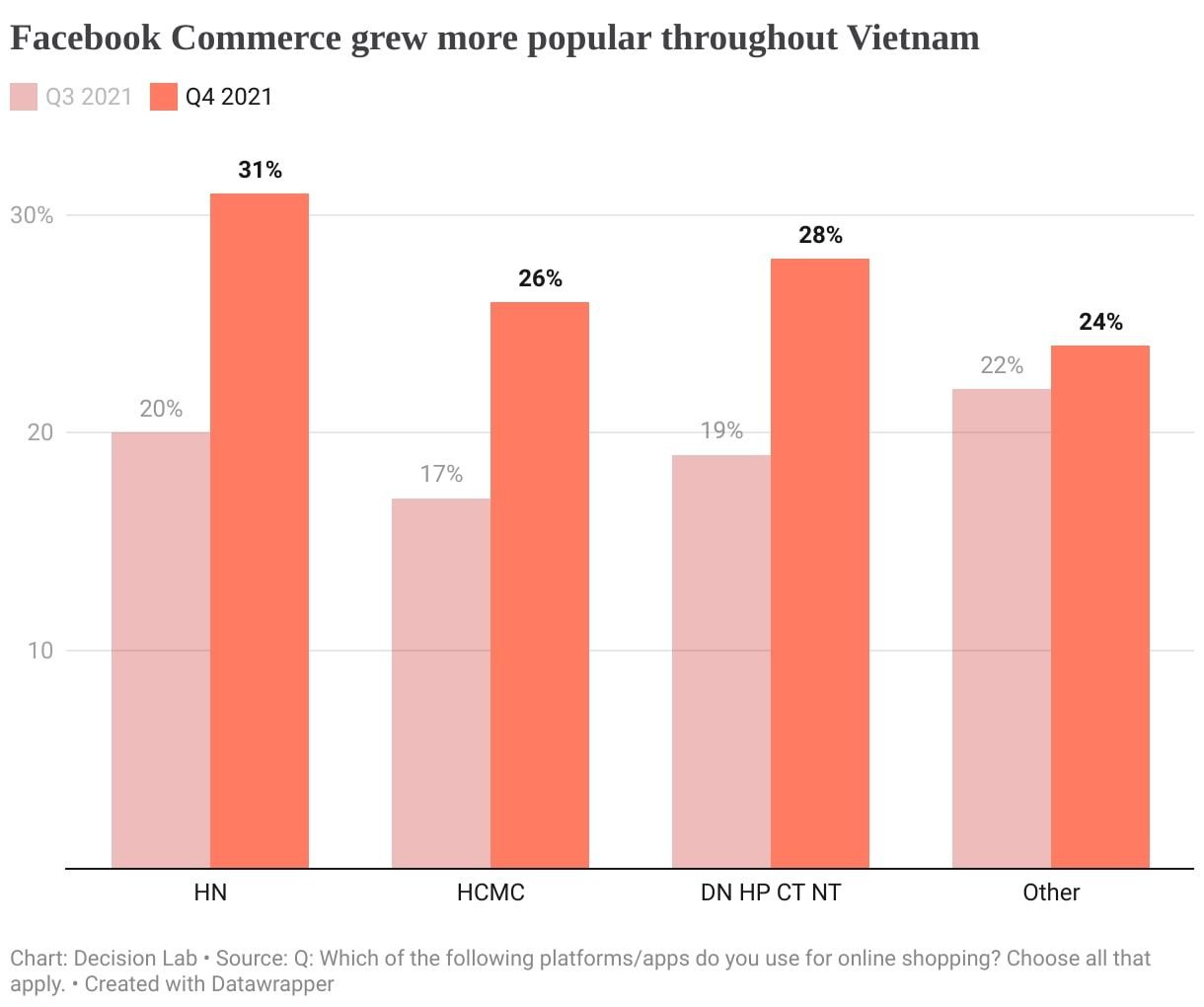 Sự tăng trưởng này cũng được thể hiện ở nhiều địa điểm tại Việt Nam. Tại Hà Nội, 31% người dùng chọn Facebook là nền tảng thương mại điện tử thường xuyên nhất, cao hơn 11% so với quý trước. Tại TP.HCM và các thành phố trọng điểm khác, tỷ lệ này là 9%.