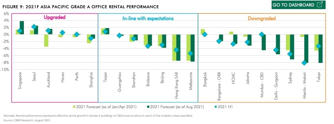 Hoạt động cho thuê văn phòng đang dần cải thiện, với nhu cầu thuê tăng so với mức thấp của năm trước. Tỷ lệ hấp thụ tăng khoảng 20% trong nửa đầu năm 2021, nhờ vào kết quả hoạt động khả quan ở thị trường Bắc Á. Nhu cầu thuê cả năm dự kiến tăng 10-15% so với cùng kỳ năm ngoái. Giá thuê văn phòng Hạng A tại các thị trường như Singapore, Đài Bắc và Seoul dự kiến sẽ tăng trưởng trên mức trước đại dịch vào năm 2023.