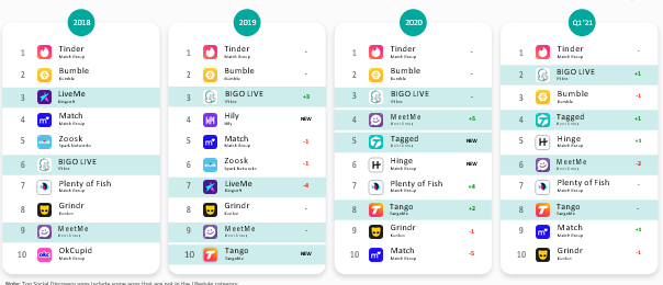 đô la vào quý 1 năm 2021. Các ứng dụng Hẹn hò chiếm phần lớn doanh thu, tiếp theo là các ứng dụng Khám phá xã hội.
