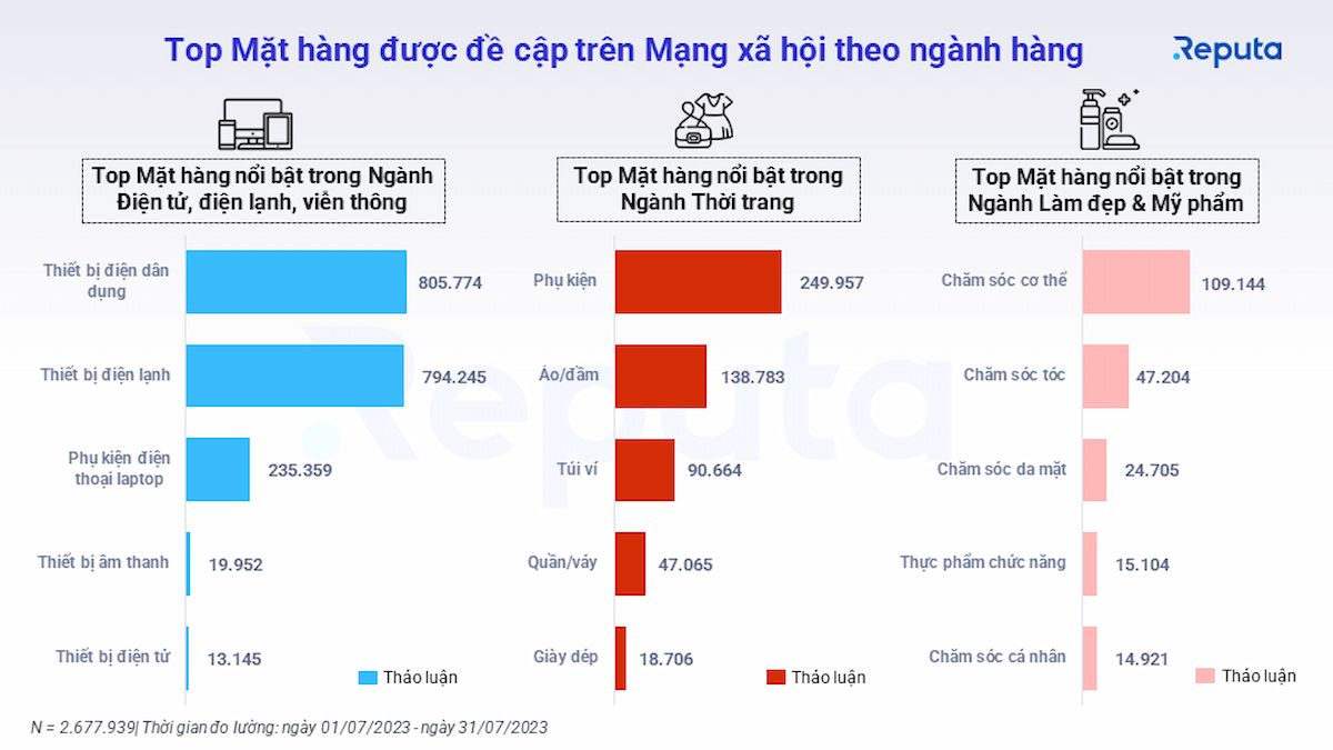 Trong các mặt hàng được đề cập trên mạng xã hội, “Thiết bị điện dân dụng” đứng đầu với gấp 1,01 lần so với “Thiết bị điện lạnh”. Trong ngành Thời trang, “Phụ kiện” được thảo luận nhiều nhất, trong khi “Chăm sóc cơ thể” được quan tâm nhiều nhất trong ngành Làm đẹp Mỹ phẩm.