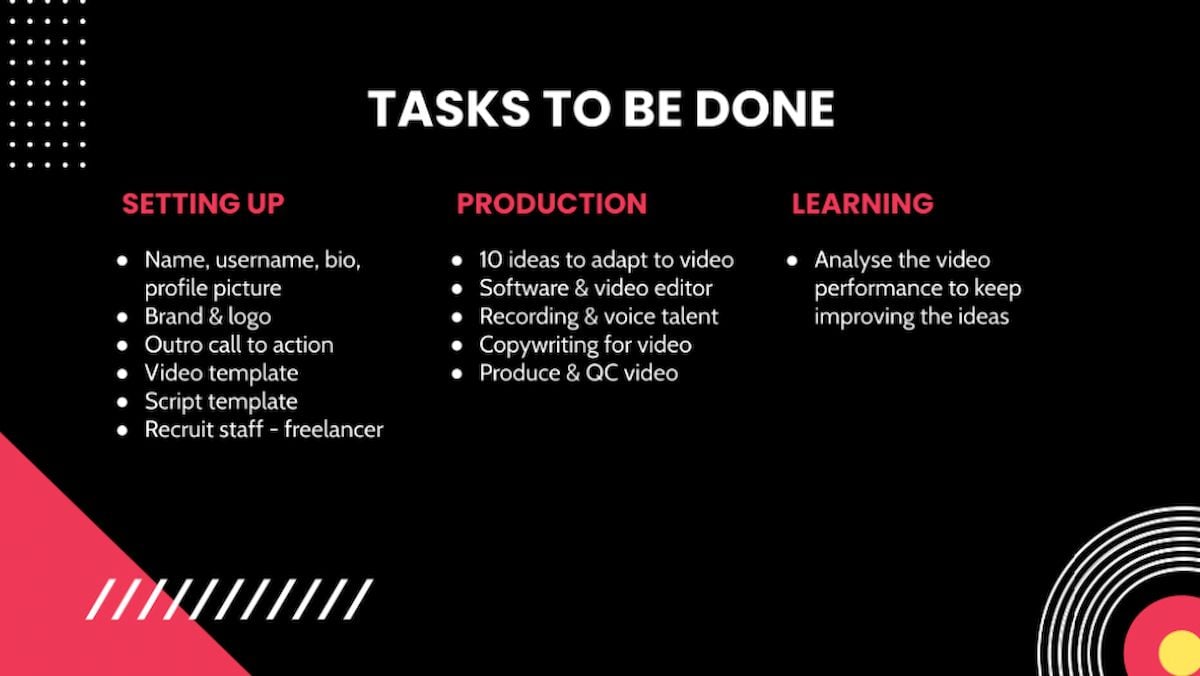 Liệt kê các đầu việc cần hoàn thành và các nguồn lực cần thiết để triển khai chiến lược của bạn. Tạo một danh sách đơn giản hoặc thiết kế một lịch nội dung chi tiết để theo dõi tiến độ.
